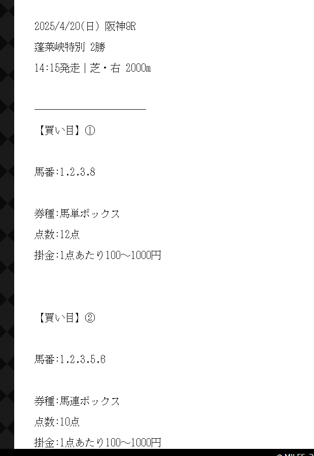 土日2日間で4鞍提供で情報料金10万円
